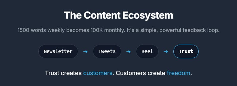 One newsletter becomes three tweets. Three tweets become a reel. The reel drives people back to the newsletter. The newsletter builds trust. Trust creates customers. Customers create freedom.