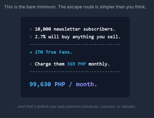 Get to 10,000 subscribers, and statistically, you have your 1000 true fans. Your personal ATM. Your escape route from wage slavery.